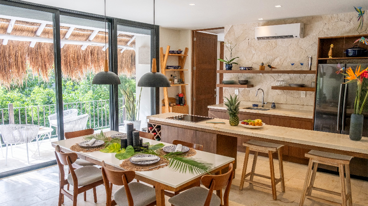 Puerta Azul, a chic boutique condominium building located inside Lúum Zama, a private compound with an-winning yoga palapa, restaurant pool and spa. This luxury building offers 9 units in total, each unit was built with large terraces & their own plunge pool. PH 302 offers total privacy with charming wrap-around terrace & floor to ceiling sliding doors allowing one to fully merge with nature & it’s tranquil environment. The apartment opens to its large living & dining area with open kitchen plan. 2 bedroom 2 & 1/2 bath, comes with marble slides throughout the apartment. Each bedroom has an ensuite bathroom with direct access to the terrace & jungle views. A stairway from the living area takes one to the private rooftop terrace with sun beds, plunge pool & lounge area. The property faces west with no neighboring buildings. Merge in its habitat and its spectacular sunsets.